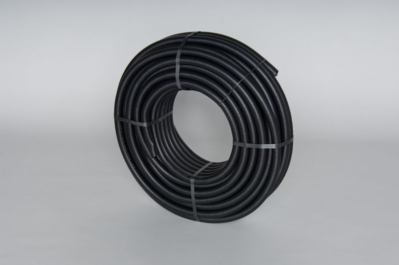 Vlnitá trubka pro mechanickou ochranu potrubí procházející otvory ve stěnách, atd., v černé barvě, podélně říznutá pro jednodušší navlékání